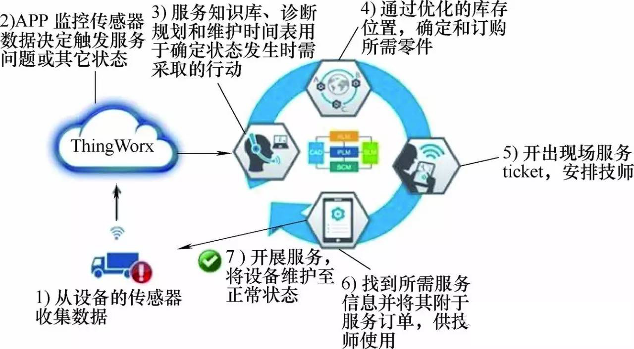 圖7是PTC公司利用ThingWork平臺所做的設備維護工作,生產設備的數據通過傳感器收集后進行分析,對需要維護的設備制訂相應計劃,在設備故障前及時進行處理。