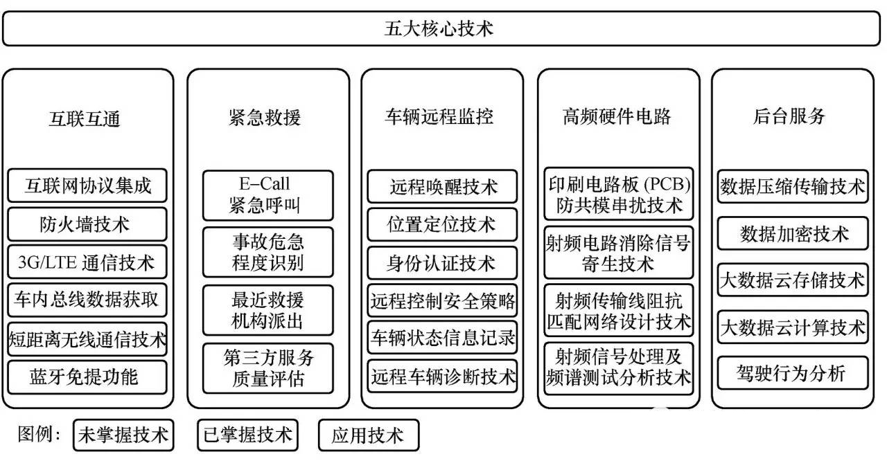 在產品大數據方面,國內外整車制造商企業進行了很多探索,如長安汽車、上汽集團等。根據一汽集團技術中心在“2015中國汽車工程學會年會”上發布的汽車TBOX功能模塊,產品大數據中大量技術尚未掌握,如圖8所示。