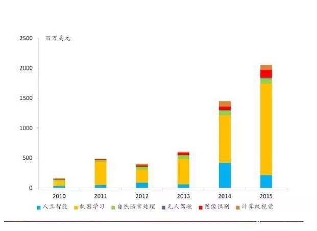 首先,人工智能產業的投資逐年增加。資本是最靈敏的風向標。從已經披露的人工智能領域投資來看,2011 年到2016 年的五年間,無論是總體融資額還是交易次數都在逐年上升,人工智能領域的創投金額5年間增長了12 倍。
