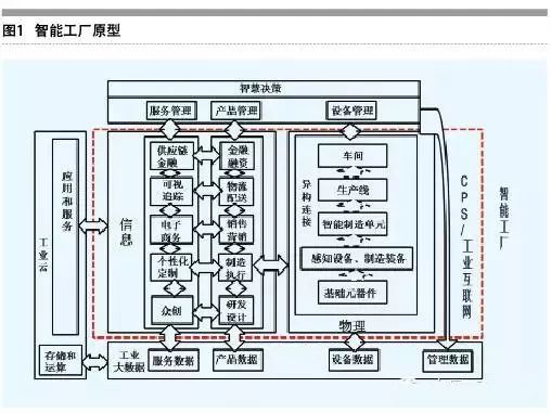 企業基于CPS和工業互聯網構建的智能工廠原型,主要包括物理層、信息層、大數據層、工業云層、決策層。其中,物理層包含工廠內不同層級的硬件設備,從最小的嵌入設備和基礎元器件開始,到感知設備、制造設備、制造單元和生產線,相互間均實現互聯互通。以此為基礎,構建了一個“可測可控、可產可管”的縱向集成環境。信息層涵蓋企業經營業務各個環節,包含研發設計、生產制造、營銷服務、物流配送等各類經營管理活動,以及由此產生的眾創、個性化定制、電子商務、可視追蹤等相關業務。在此基礎上,形成了企業內部價值鏈的橫向集成環境,實現數據和信息的流通和交換。