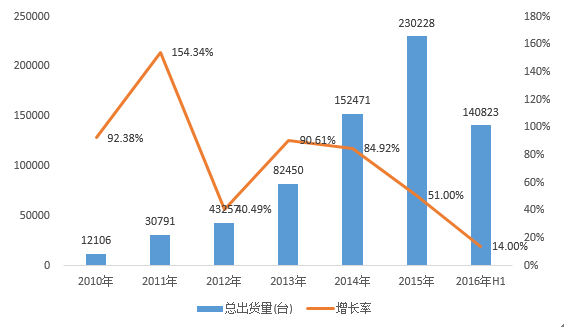 圖表:2008-2015年全球3D打印設備出貨量增長情況