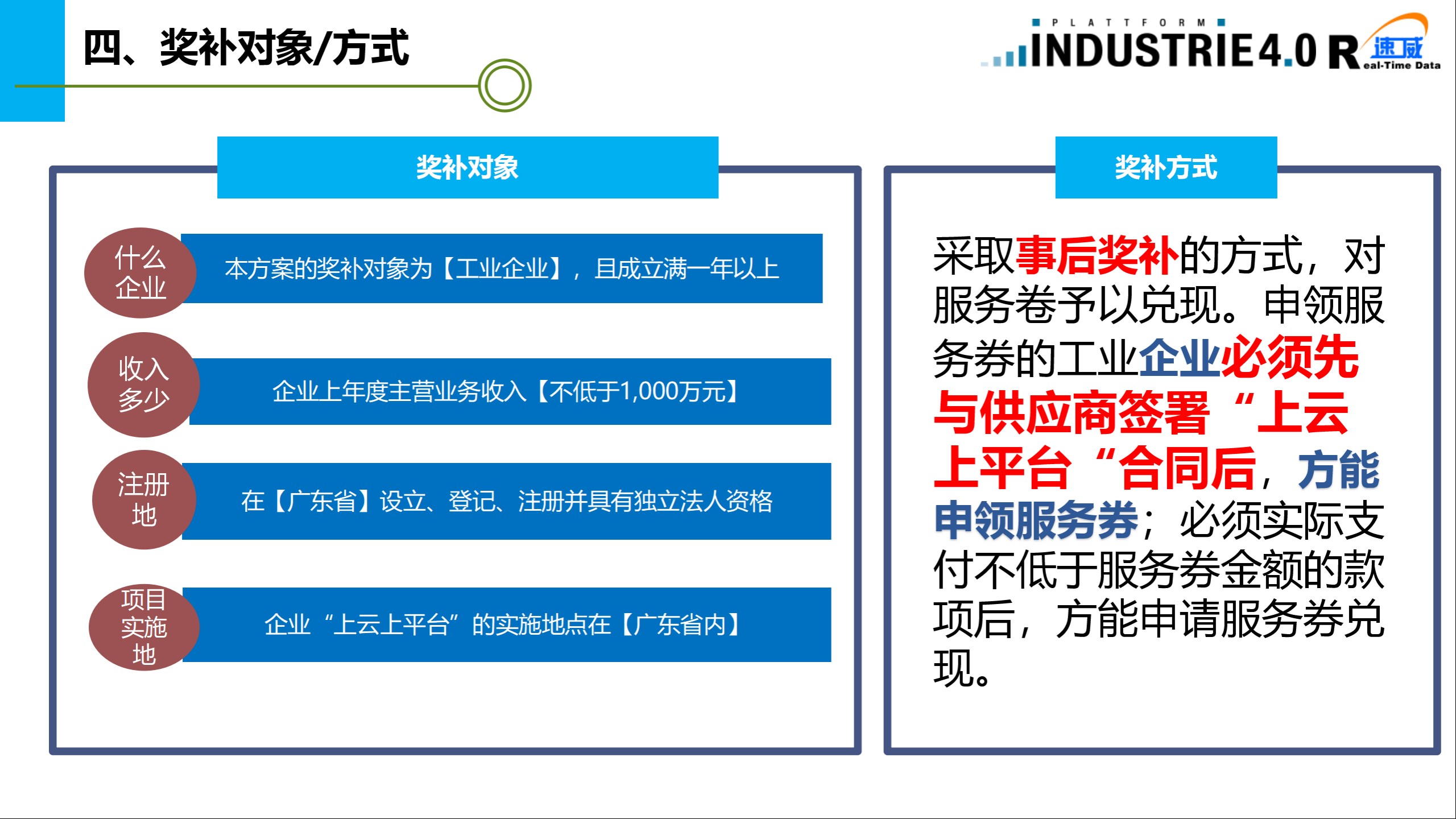 廣東省經濟和信息化委于2018年9月印發《廣東省工業企業上云上平臺服務卷獎補工作方案(試行)》的通知粵經信融合函【2018】47號,支持工業企業“上云上平臺”,三年給予支持1萬家工業企業實現降低成本、增效提質。