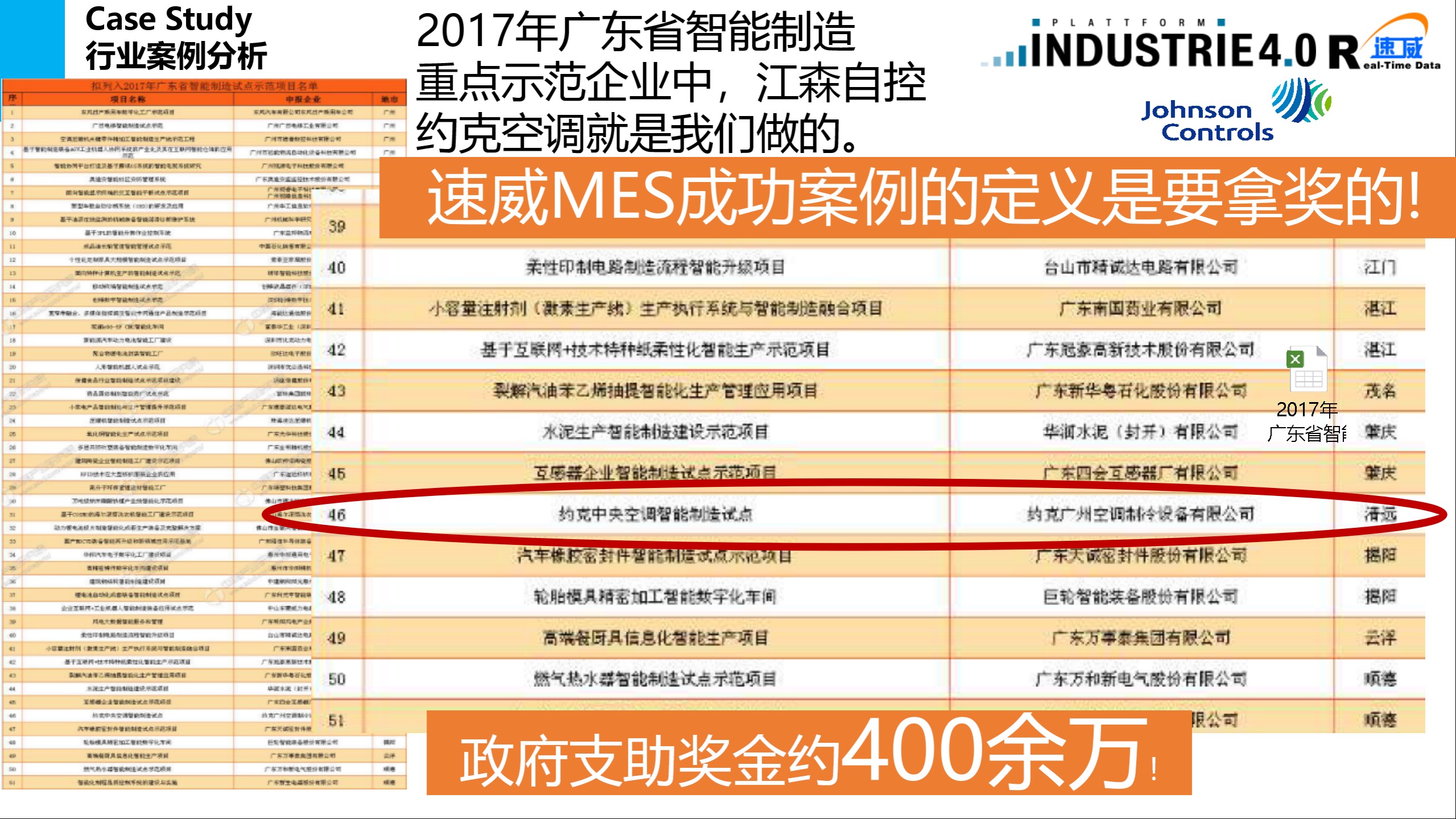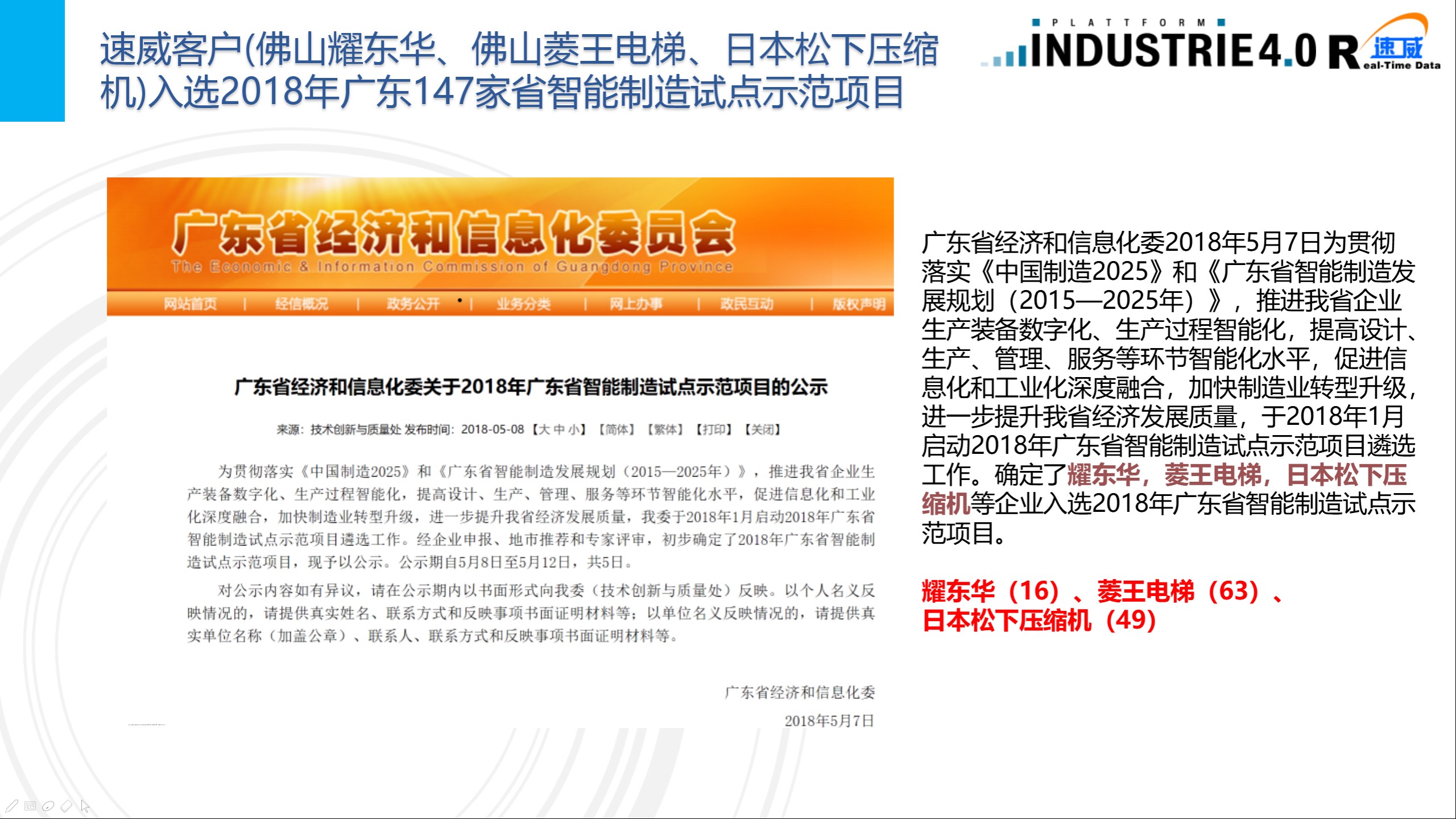 ◆ 2018年速威客戶佛山耀東華(序號16)、佛山菱王電梯(序號63)、日本松下壓縮機(序號49),入選廣東147家省智能制造試點示范項目。(文件:廣東省經濟和信息化委關于2018年省智能制造試點示范項目的公示)