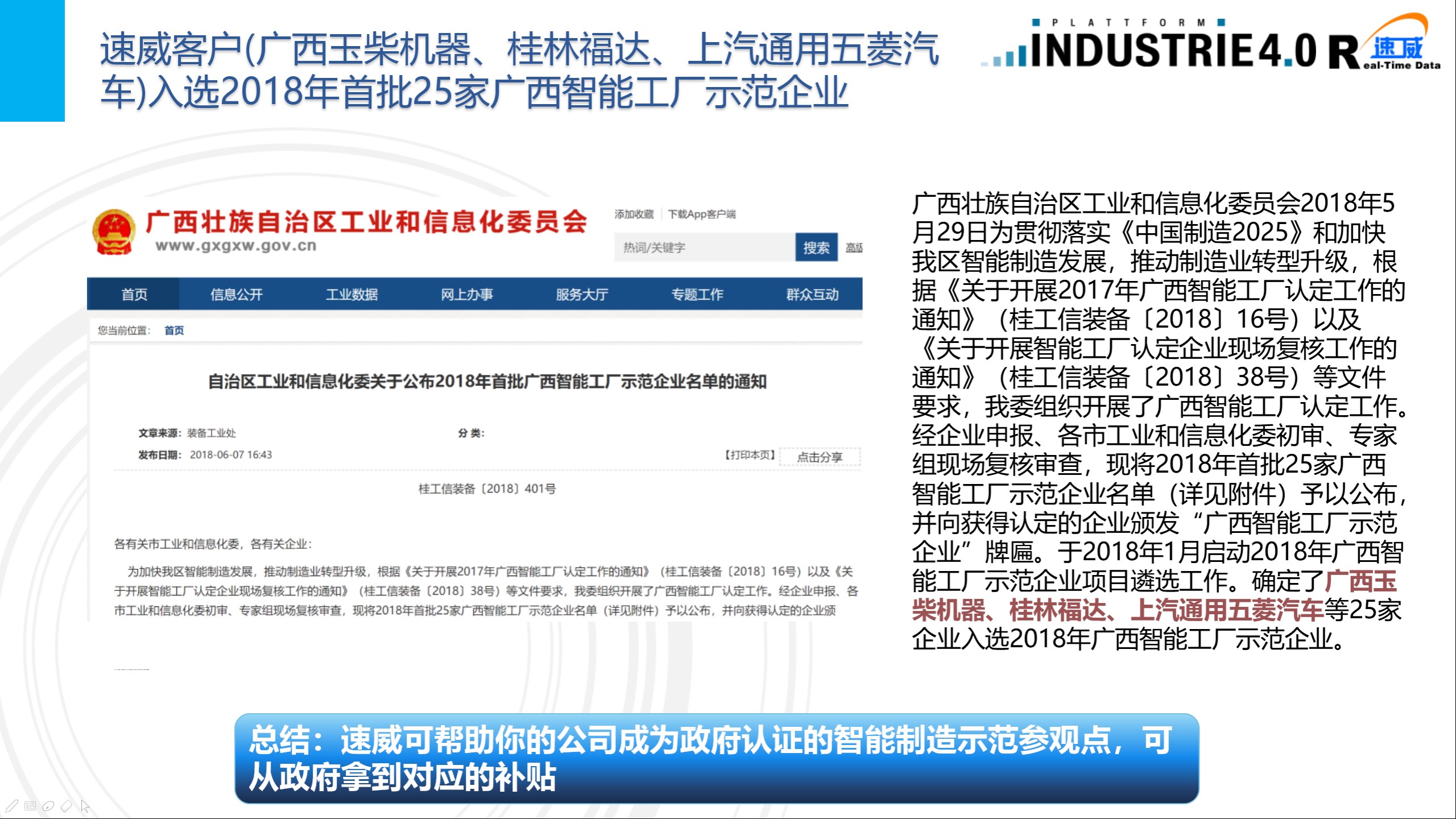◆ 2018年速威客戶(廣西玉柴機器、桂林福達、上汽通用五菱汽車)入選2018年首批25家廣西智能工廠示范企業。(文件:自治區工業和信息化委關于公布2018年首批廣西智能工廠示范企業名單的通知)