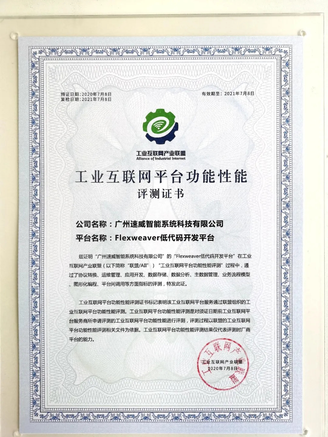 近日,中國信通院聯合聯盟成員單位編制發布了《工業互聯網平臺測試驗證》聯盟標準(AII/001-2019)。標準驗證過程中,中國信息通信研究院對廣州速威智能系統科技公司FlexWeaver低代碼開發平臺進行功能性能測試,FlexWeaver低代碼開發平臺以優異的綜合評測成績通過測試!