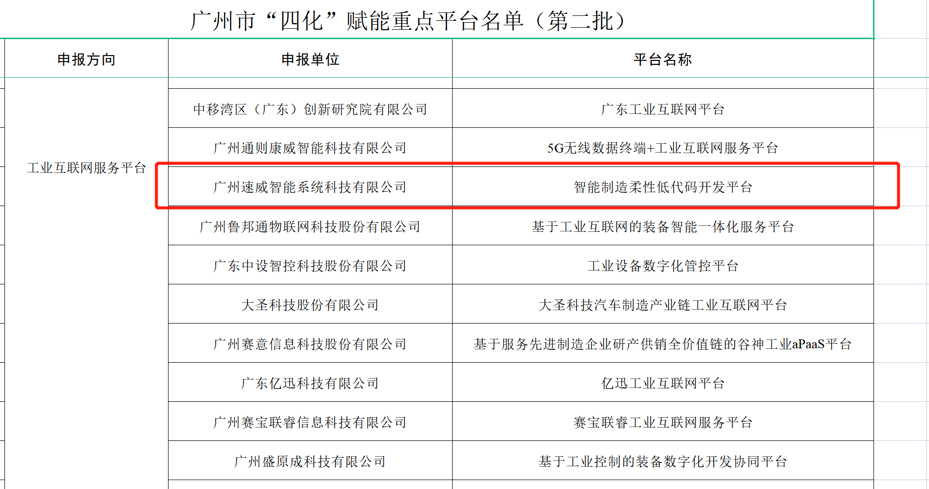 2023年7月14日,廣州市工業和信息化局公布了第二批廣州市“四化”賦能重點平臺名單,廣州速威自主研發的智能制造柔性低代碼開發平臺,成功在全省數百家供應商中脫穎而出,入選到廣州工信局“四化”賦能工業互聯網服務平臺18家的大名單中。