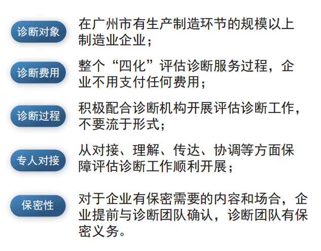 對于開展“四化”評估診斷工作企業無需支付任何費用,費用由廣州市工業和信息化局直接向第三方評估診斷機構提供,市工業和信息化局通過迸選、備案等方式確定診斷機構名單。