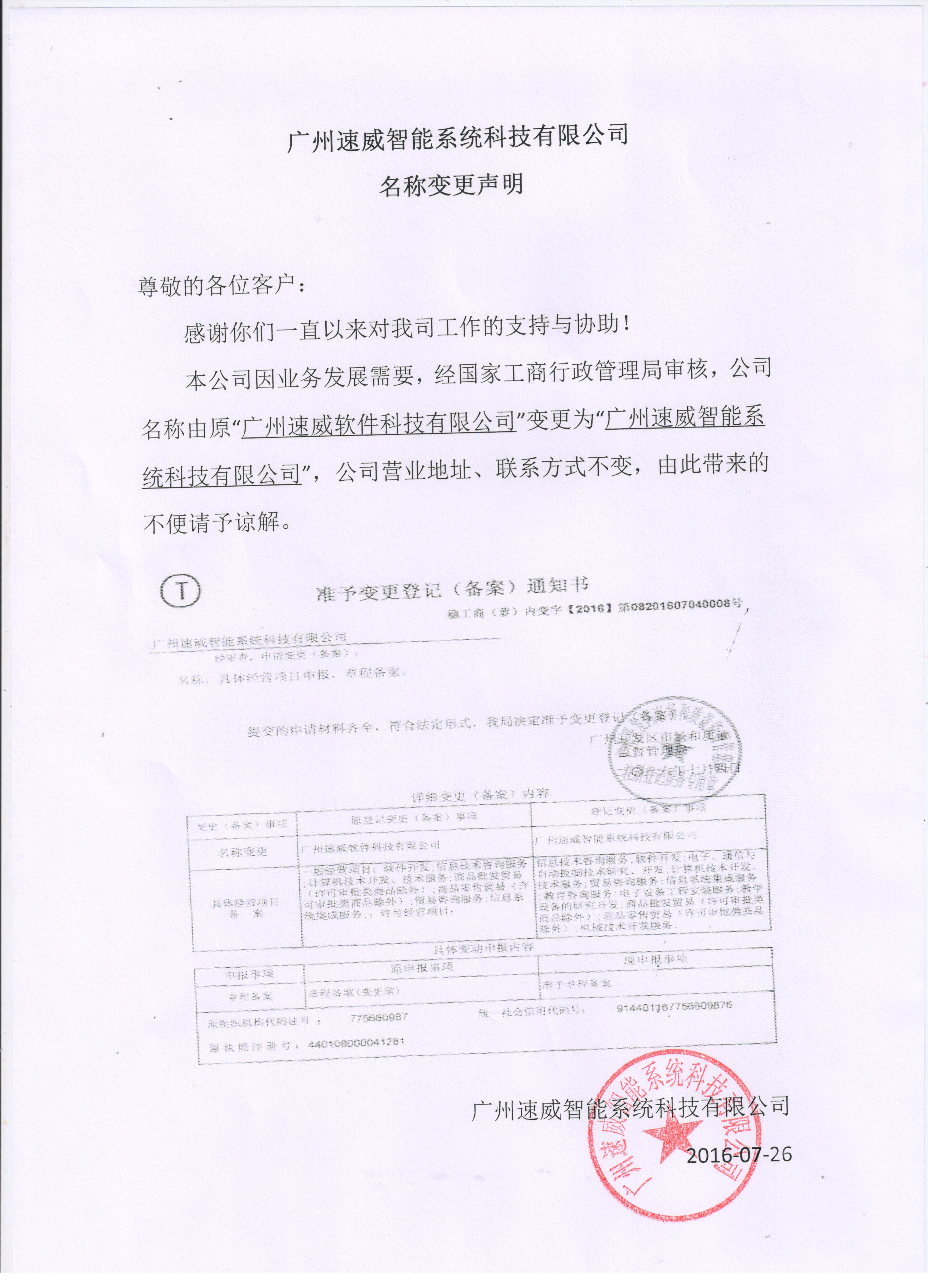 感謝朋友們10+年對本公司的支持。因業務需要,公司由《廣州速威軟件科技有限公司》更名為《廣州速威智能系統科技有限公司》。同時業務范圍也拓展為: