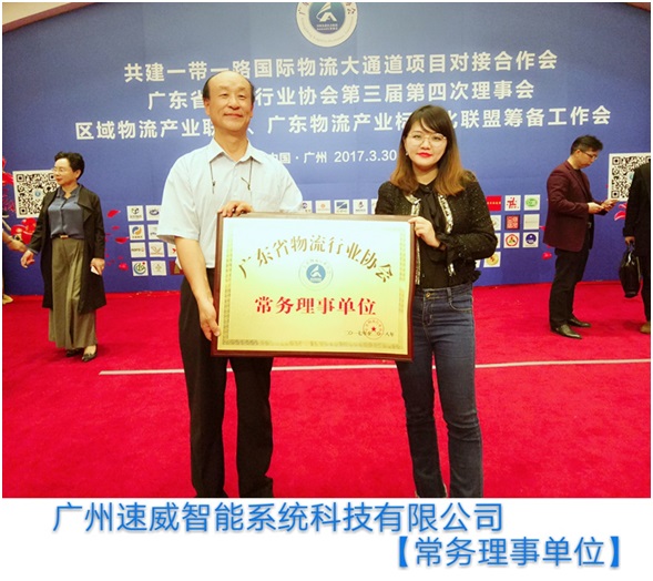 2017年3月30日,廣州速威智能作為新任的廣東省物流行業協會第三屆第四次理事會的常務理事單位,出席了協會本次國際性的會議(第三屆第四次理事會暨共建“一帶一路”國際物流大通道項目對接合作會以及區域物流產業聯盟、廣東物流產業標準化聯盟籌備會),已會人員近400人,其中參會的還有中俄物流行業促進會、安哥拉共和國駐廣州總領事館、吉爾吉斯斯坦駐廣州總領事館等。