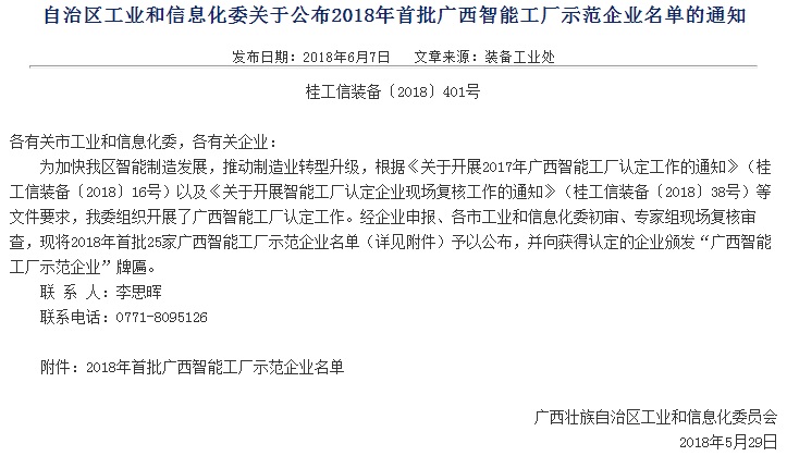 自治區工業和信息化委關于公布2018年首批廣西智能工廠示范企業名單的通知
