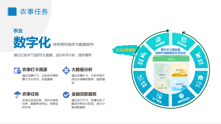 可對農場全生產流程的每個環節進行信息化、智能化管理,包括規劃生產流程、自動化任務管理、即時溝通交流、巡園監督管理、病蟲害圖像識別、農資投入品管理等。