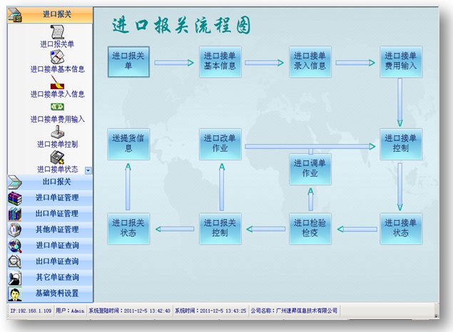 該《報關管理系統》主要分為進口報關、出口報關、基礎資料、進口單證管理、出口單證管理、進口單證查詢等大模塊。
