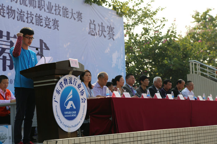 本次大賽開幕式由承辦單位——廣東省交通運輸技師學院劉珺副院長主持。閻子剛院長致歡迎辭。參賽選手代表涂云塾、裁判長何望分別代表選手、全體裁判員宣誓。本次大賽的冠名單位--廣州速威智能系統科技有限公司郭孔快董事長就物流信息化和裝備智能化進行發言。